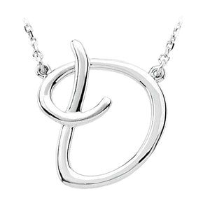 Express your individuality with this beautiful, script initial necklace. Rendered in sterling silver, each letter measures between 5/8 inches to 3/4 inches long and includes a 16 inch diamond-cut, 1mm cable chain.