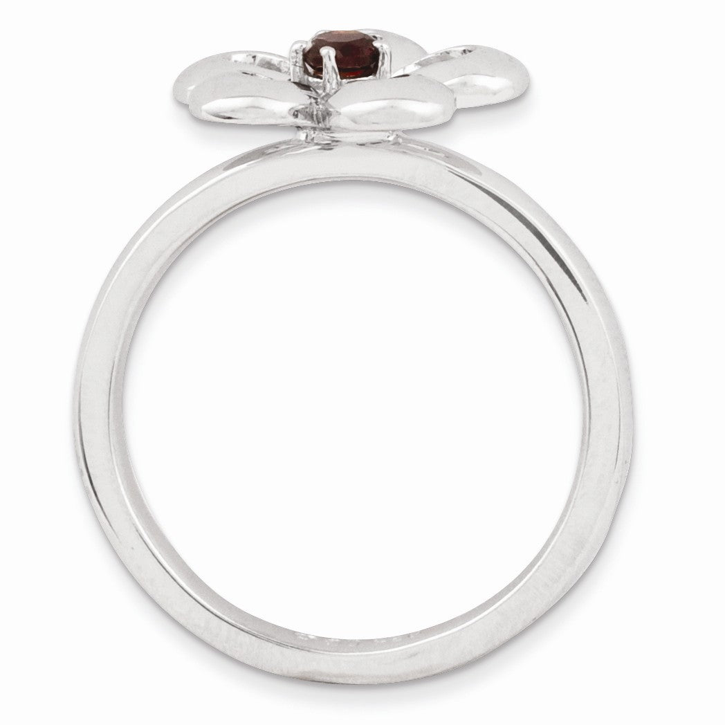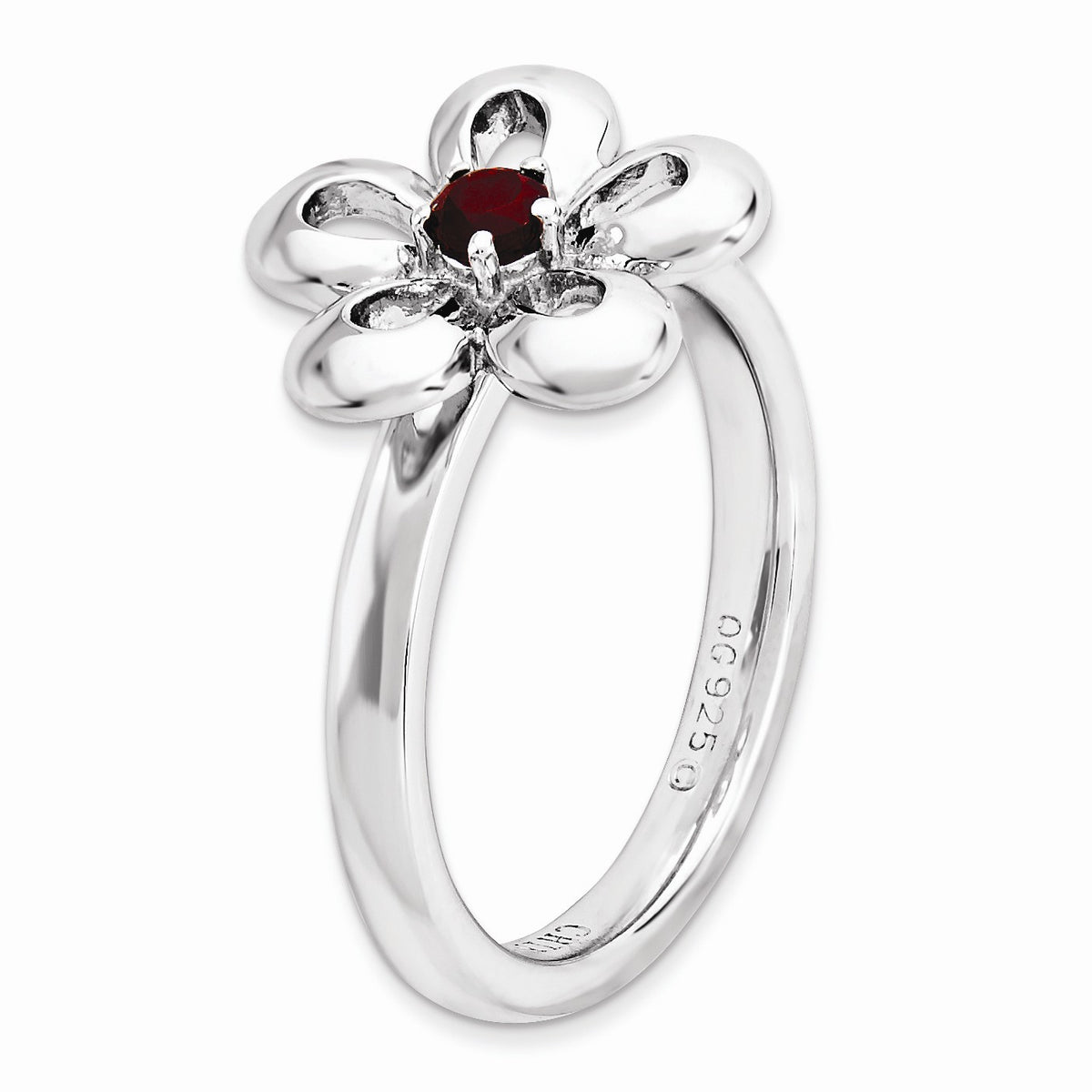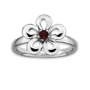 Garnet, January's birthstone symbolizes romance, love and passion; it is also believed to bring inspiration. This 2.5mm smooth polished band fashioned from rhodium plated sterling silver features a flower with silver looped petals and a prong set faceted garnet in the center. Guaranteed to fit together perfectly with all of the mix and match Stackable Expressions rings.