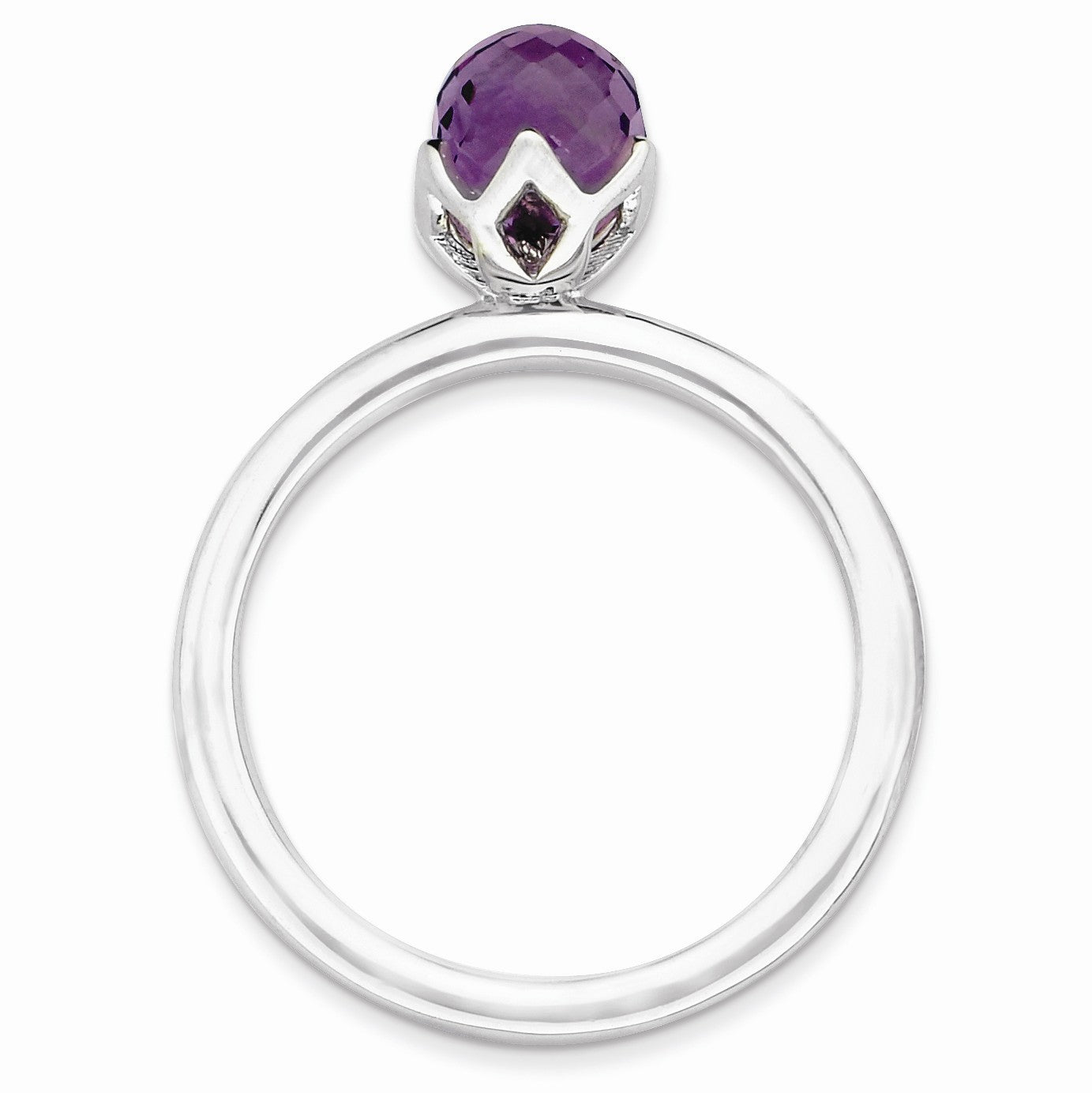 Amethyst, February's birthstone is known as the stone of the mind, bringing calmness and clarity. This 2.5mm polished band of rhodium plated sterling silver features a mesmerizing 1 carat amethyst briolette that will stand out and make a statement. Guaranteed to fit together perfectly with all of the mix and match Stackable Expressions rings.