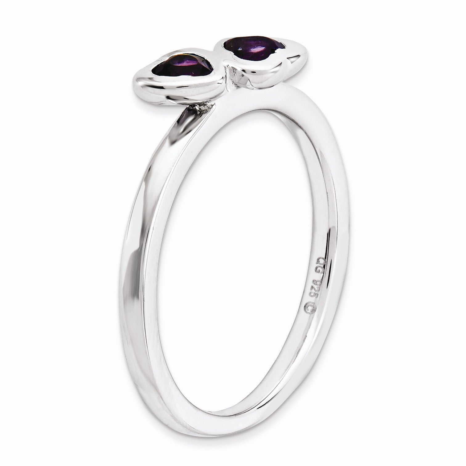 • Amethyst, February's birthstone is known as the stone of the mind, bringing calmness and clarity. This 2.5mm smooth polished band features two vibrant, 4mm heart shaped amethysts bezel set in rhodium plated sterling silver. Guaranteed to fit together perfectly with all of the mix and match Stackable Expressions rings. Gemstone treatment: traditional heated process.