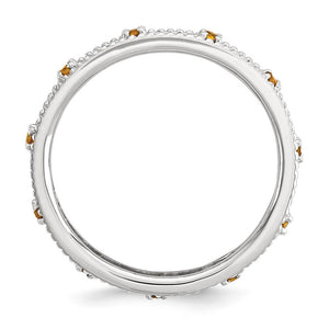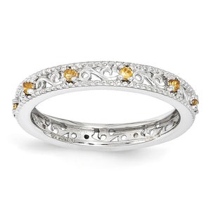 Express your own style with a fresh look for any season by mixing and matching different designs, widths and colors to suit your mood. This 3mm width open back band created from tarnish resistant rhodium plated sterling silver features a scroll design prong set with genuine citrine stones and a milgrain edge. The heat-treated gemstones are 1. Mm in size and the total gemstone weight is 0.35 of a carat. Color range varies on all natural stones so please allow for slight variations in shades. Wear it alone or in meaningful combinations, guaranteed to fit together perfectly with all of the mix and match Stackable Expressions rings.