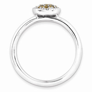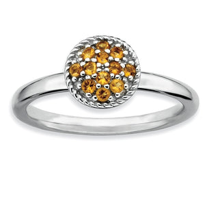 Citrine, November's birthstone enhances self-confidence, self-discipline and creativity bringing happiness and optimism. This 2.5mm smooth polished band fashioned from rhodium plated sterling silver features a low profile mounting prong set with 12 faceted gemstones totaling 1/5 of a carat. Guaranteed to fit together perfectly with all of the mix and match Stackable Expressions rings.