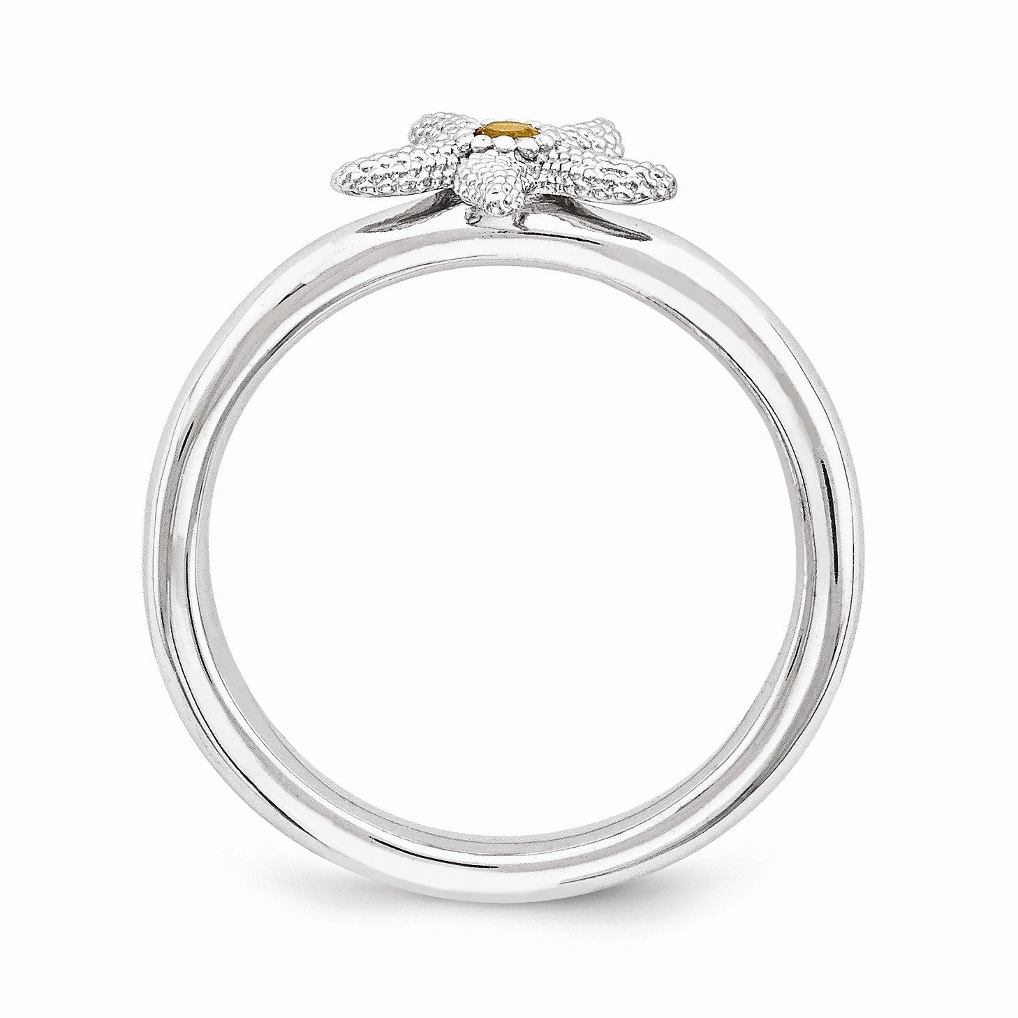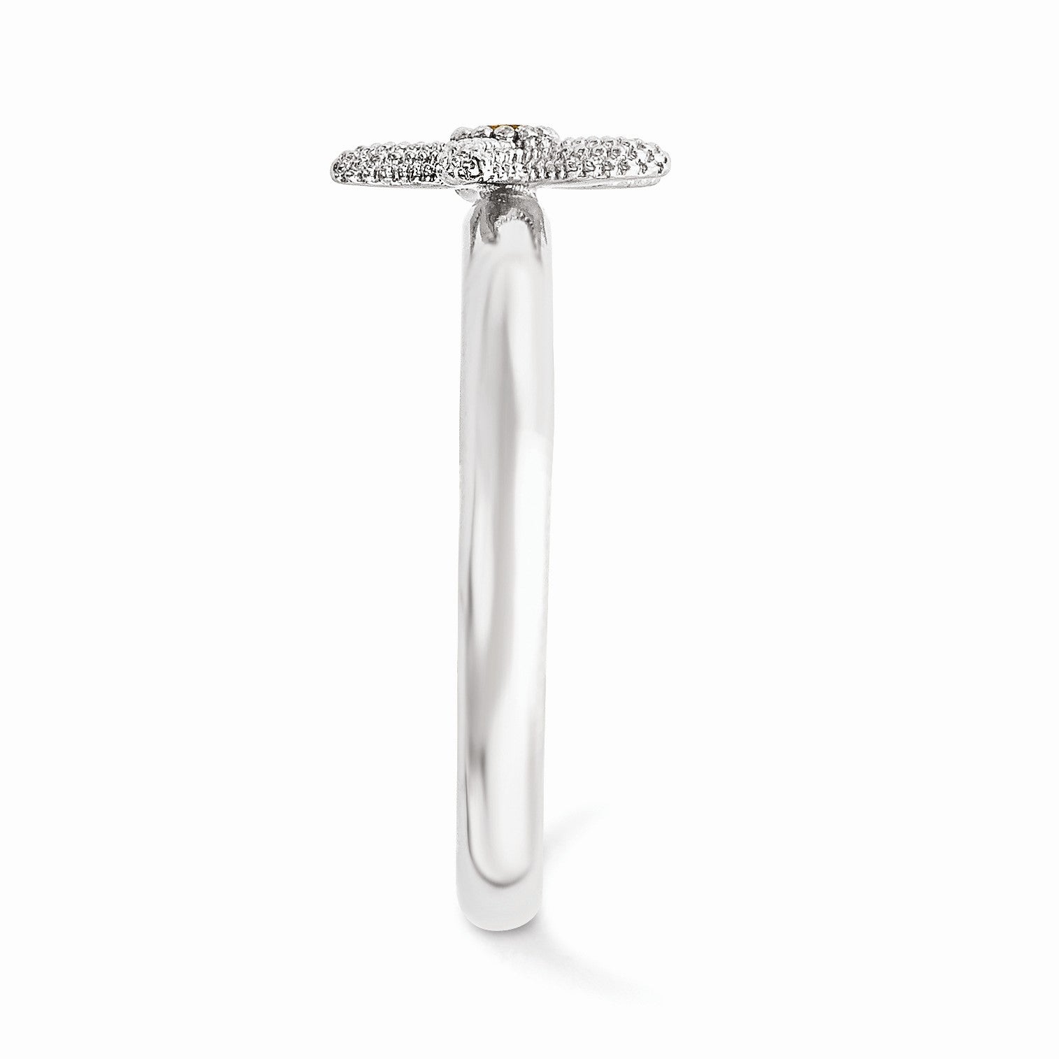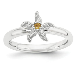 Create a look that is all your own with a fun assortment of rings that looks great alone or stacked in a collection to express your own unique style. This gemstone ring fashioned from tarnish resistant rhodium plated sterling silver features a textured 10mm starfish with a prong set genuine citrine and a 2. Mm width polished band. The heat-treated citrine is 2mm in size and the stone weight is 0.3 of a carat. Color range varies on all natural stones so please allow for slight variations in shades. Guaranteed to fit together perfectly with all of the mix and match Stackable Expressions rings.