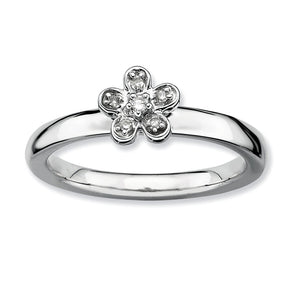 You cannot go wrong by adding a diamond ring to any stackable combination. This polished 2.5 band fashioned from rhodium plated sterling silver features a diamond studded flower. The 6 round, I3 clarity, H-I color diamonds total 1/20 of a carat. Guaranteed to fit together perfectly with all of the mix and match Stackable Expressions rings.