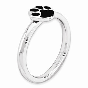 Create a look that is all your own with a fun assortment of rings that looks great alone or stacked in a collection to express your own unique style. This polished ring fashioned from tarnish resistant rhodium plated sterling silver features a 7 x 7mm paw print with a black enamel finish and a 2.5mm width band. Guaranteed to fit together perfectly with all of the mix and match Stackable Expressions rings.