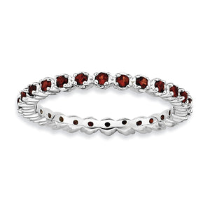 Garnet, January's birthstone symbolizes romance, love and passion; it is also believed to bring inspiration. This 2.5mm wide band fashioned from rhodium plated sterling silver is prong set with round gemstones totaling .0 of a carat. Guaranteed to fit together perfectly with all of the mix and match Stackable Expressions rings.