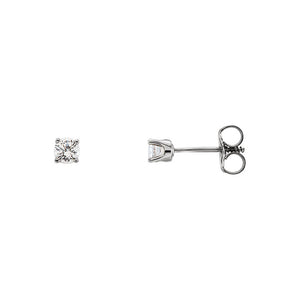 Classic styling and timeless beauty suitable for all ages featuring a 3mm natural diamond cradled in a 4-prong closed back setting of 14k white gold finished with a threaded post and push-on screw-off back for a secure fit. Each full cut diamond is I2 in clarity, G-H in color and the total diamond weight for the pair is 1/5 of a carat.