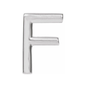 Initial attraction in a classic block style with a friction post and back fashioned from rhodium-plated 14k white gold. Each earring is sold individually so that you can personalize your style with any combination. Each initial is approximately 8mm (5/16 inch) in length by 1mm in thickness. The letter F is 5.25mm in width. This is a made to order item and is estimated to ship 11/24/2025