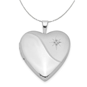 Show off your loved ones and keep them close with this 20mm heart locket fashioned from sterling silver featuring a contrasting polished and satin finish accented with a diamond star design. Opens to hold two small photos or keepsakes and is suitable for hand engraving only. Prong set diamond is I2-I3 in clarity, I-J in color and weighs .01 carat. Includes a 1.25mm, 24 inch sterling silver cable chain.