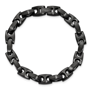 Classic appeal with a modern design, this advanced anchor style chain created from brushed black-plated stainless steel is finished with a fold over clasp. It is approximately 8mm width and 9-inches in length, this heavy bracelet looks great alone or layered with other chains.