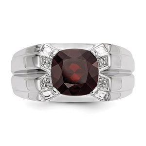 Garnet, glowing deep red with hints of orange and brown offers a sophisticated yet organic look. This diamond accented tapered ring design features grooved sides and a 3.-carat genuine cushion-cut garnet cradled in a 4-prong setting of tarnish resistant rhodium plated sterling silver. It is approximately 11mm in width at the top and tapers to roughly 4mm at the bottom. The prong-set natural diamonds are I2-I3 in clarity, H-I in color and the total diamond weight is 0.2 carat. The color range varies on all natural stones so please allow for slight variations in shades. Available in whole size 9- 11 only.