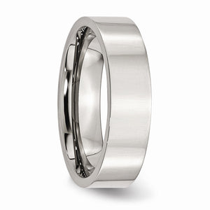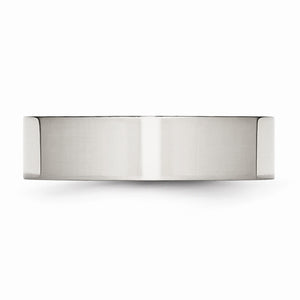 Sleek and simple with a contemporary flat profile designed from stainless steel with a high polished finish. This 6mm wide band also features a comfort fit interior or a rounded inside shank so it will slide easily and rest comfortably on the finger.