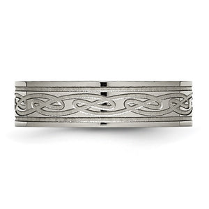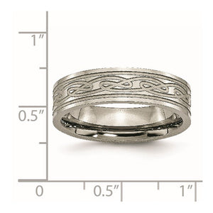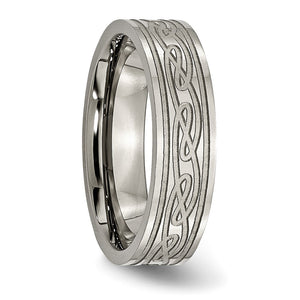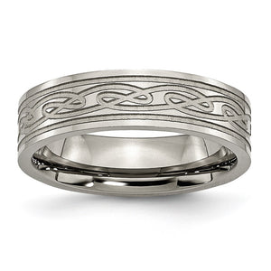 A timeless, Celtic knot ring is both meaningful and beautiful, representing longevity. It is crafted from durable, lightweight titanium and features a flat profile, a polished and laser etched design and a comfort fit shank. It is also hypoallergenic making it ideal as a wedding band or fashion ring. Suitable for engraving.