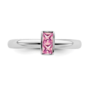 Make it simple and stylish with bands of different textures, finishes, widths and colors or extravagant with diamonds and gemstones! This stackable ring created from rhodium-plated .25 sterling silver features 2 princess-cut genuine pink tourmaline stones totaling 3/8 carat. The approximate band width is 2. Mm and the ring top is approximate 4 x 6.5mm. The color range varies on all genuine gemstones so please allow for slight variations in shades (light to medium dark pink). The color on your screen may also not reflect actual gemstone color due to variations in monitors. Guaranteed to fit together perfectly with all of the mix and match Stackable Expressions rings.