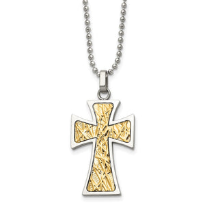 Celebrate and honor all special occasions with jewelry of religious significance! Our collection of spiritually inspired designs that show faith, hope and devotion are perfect for commemorating life's milestones. This two-tone stainless steel necklace features a 14k yellow gold textured accented design on a polished Maltese cross pendant that is approximately 22mm (7/8 inch) in width by 43mm (1 5/8 inches) in length, which includes the bail. It hangs on a 2mm width by 22-inch-long polished bead chain that closes with a fancy lobster clasp. Suitable for engraving on the back.