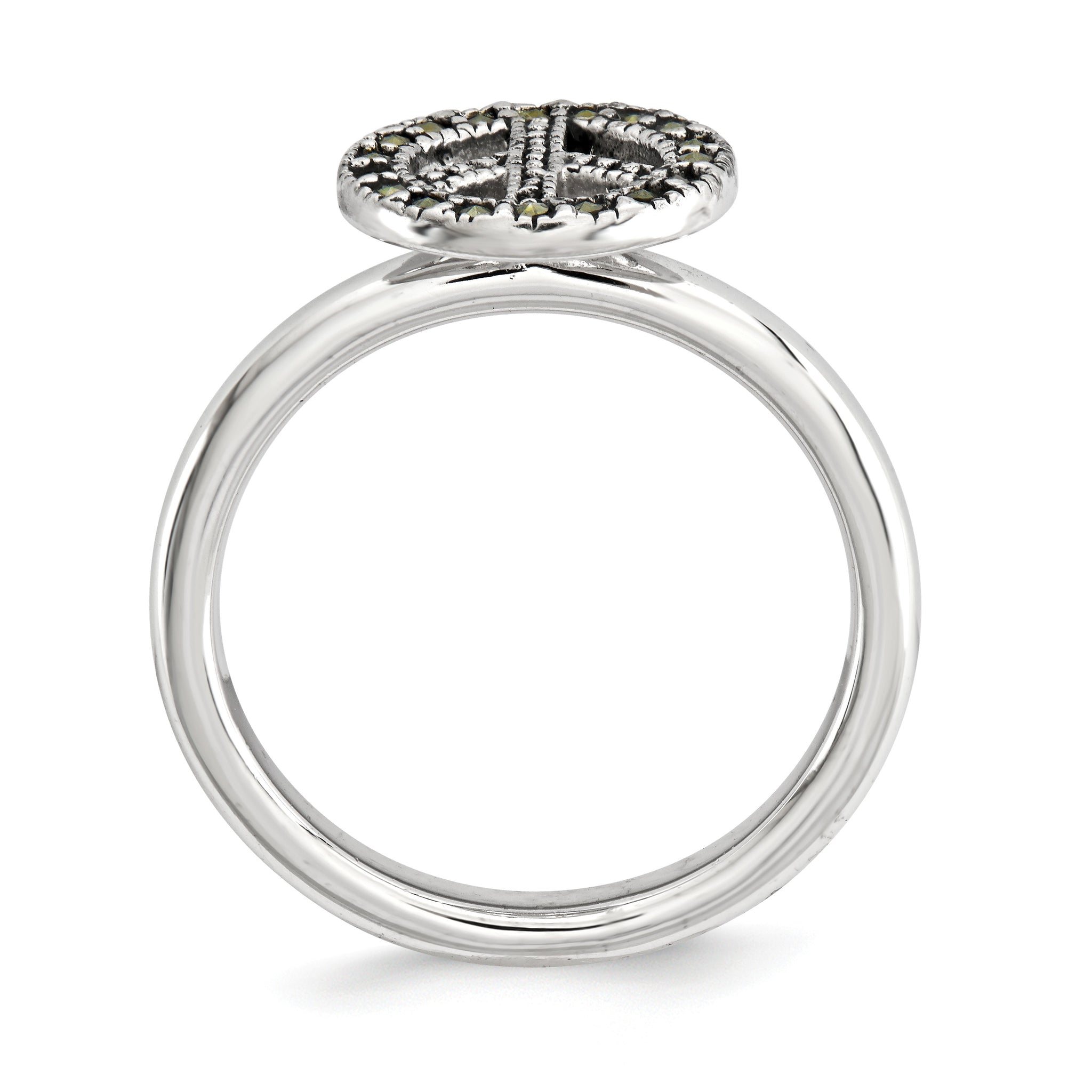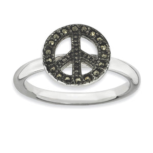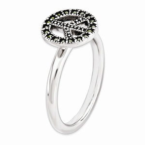Fun and whimsical, appealing to all ages and can be worn alone or featured in a collection. This 2.5mm rhodium plated sterling silver band features a 11mm peace sign outlined with sparkling marcasite stones. Guaranteed to fit together perfectly with all of the mix and match Stackable Expressions rings.
