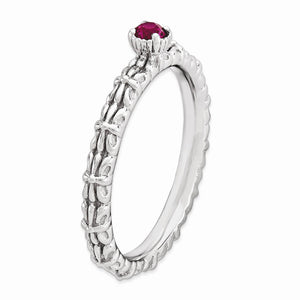 Ruby, the gemstone that brings red to vivid life is certain to draw attention. This single stone interlocking stackable ring features a round lab created ruby that is prong set atop a 2. Mm patterned rhodium-plated sterling silver band. The synthetic gemstone is 3mm in size and the carat weight is 0.1. Created rubies like their natural counterparts can range from pink to deep red so please allow for variations in color. Wear it alone or in stacked in a collection to complete an easy elegant look. Guaranteed to fit together perfectly with all of the mix and match Stackable Expressions rings.
