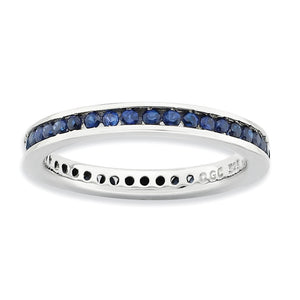Timeless style! Vibrant created sapphires are channel set in rhodium plated sterling silver all the way around this 2. Mm eternity synthetic gemstone band. Created sapphires like their natural counterparts can range from deepest midnight to brilliant cornflower blue so please allow for variations in color. Guaranteed to fit together perfectly with all of the mix and match Stackable Expressions rings.