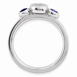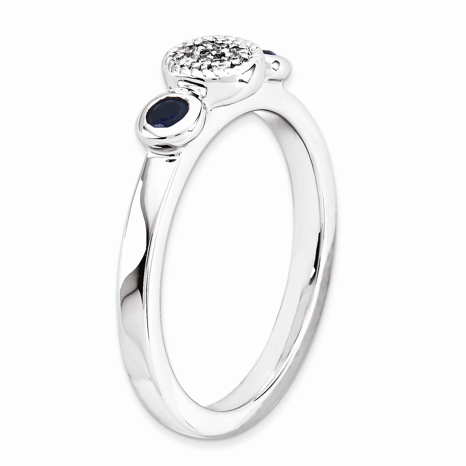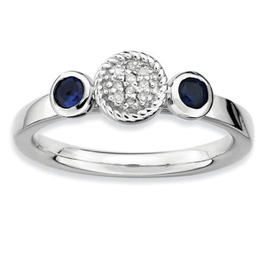 Created Sapphire, September's birthstone symbolizes truth, faithfulness and honesty bringing calmness and peace. Diamonds of course are said to be a girl's best friend. This 2.5mm polished band fashioned from rhodium plated sterling silver is prong set with 10 round diamonds flanked by two bezel set round created sapphires. The round center cluster mounting is approximately 6mm in width. Guaranteed to fit together perfectly with all of the mix and match Stackable Expressions rings.