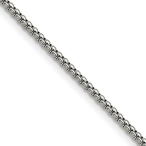 Simplicity and glamour come together as one in this sleek, round box chain fashioned from durable stainless steel with a gleaming, polished finish. It measures 2.2mm in width, 18 inches in length and closes with a fancy lobster clasp.