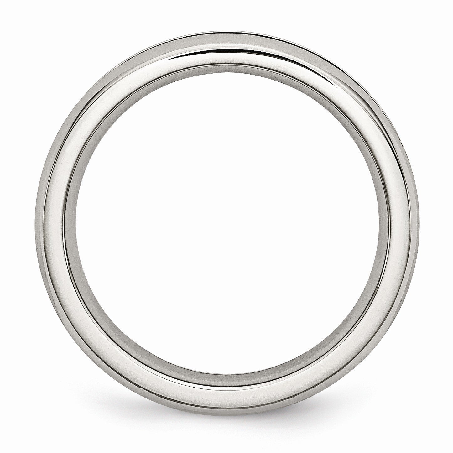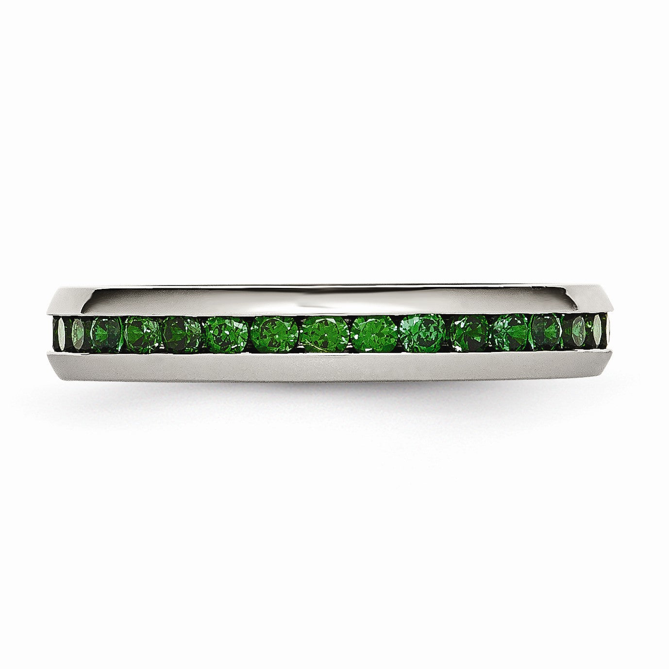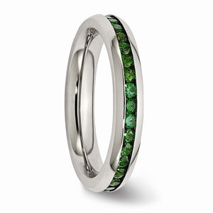 Wear alone or mix with other stack rings to create your own look! This 4mm eternity band fashioned from polished 316L stainless steel is channel set with green cubic zirconia gemstones all the way around.