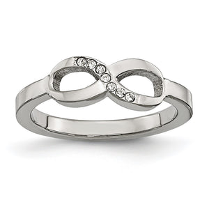 The infinity loop symbolizes perfection, eternity, and everlasting love. This polished stainless steel ring features an elegant infinity design with a beautiful meaning that is flush-set with 7 cubic zirconia gemstones. It is approximately 6mm (1/4 inch) across the top and has a standard fit 2mm shank. Available in whole sizes only 6-9.
