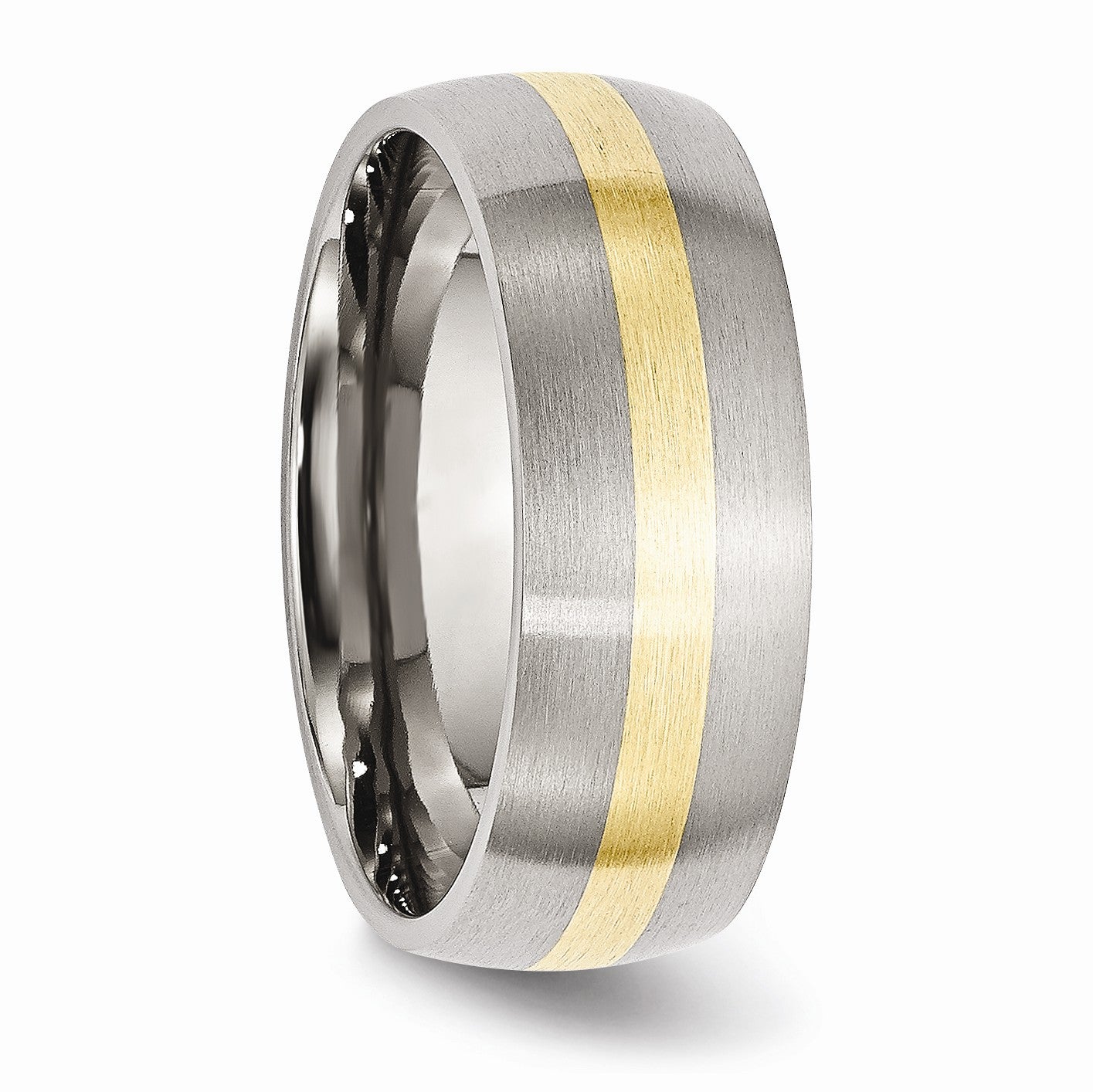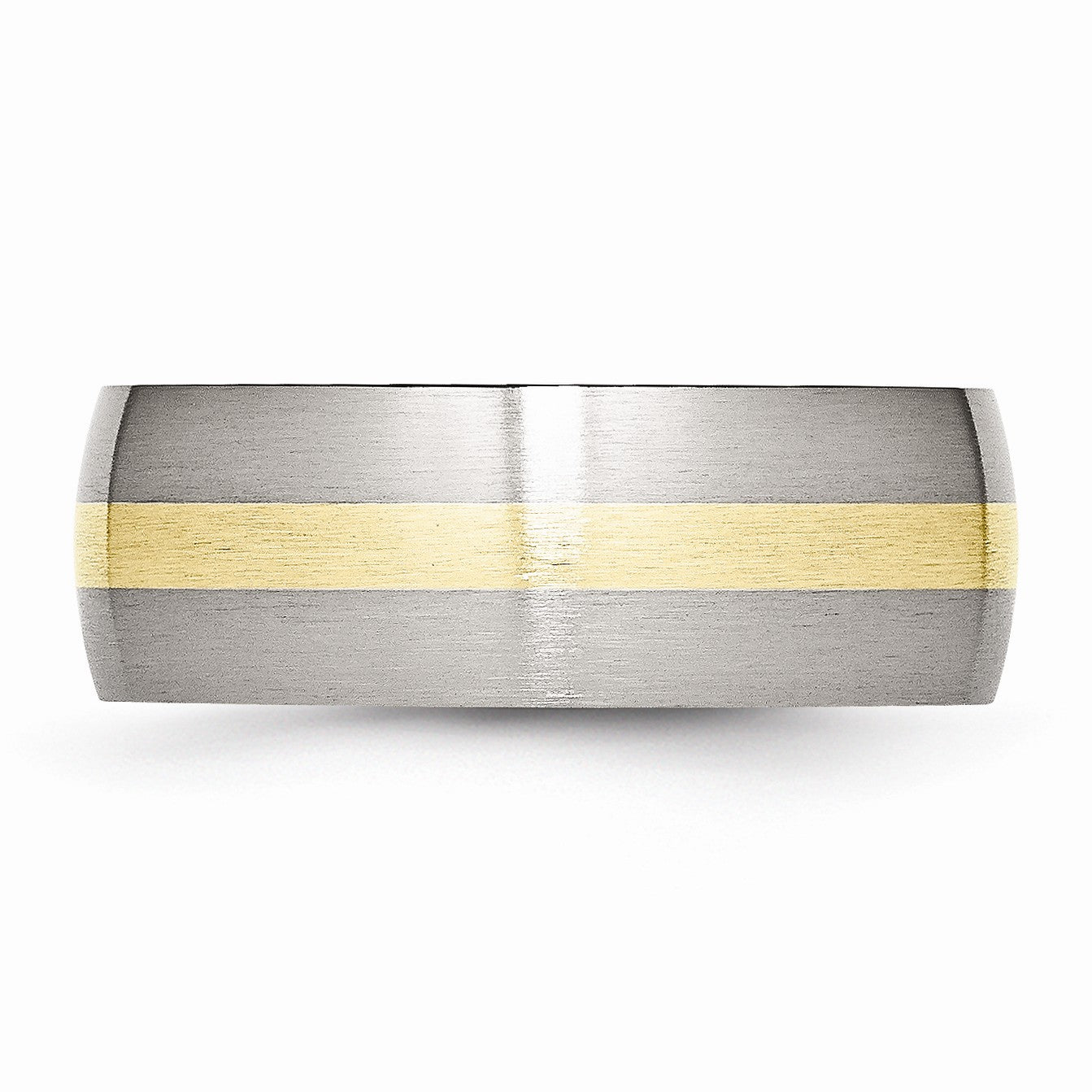 A simple, thick band of curving, 316L stainless steel is accented with a single, 14k gold stripe that adds contrast to this classic design. The band measures 8mm wide and features a trendy, satin finish. Available in whole and half sizes 6-13.