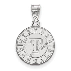 It is time to celebrate your favorite Major League Baseball (MLB) team, the Texas Rangers! We are a certified retailer, and this authentic women's medium laser-etched pendant is officially licensed. It is created from rhodium plated sterling silver and approximately 15mm in width (9/16 inch or smaller than a dime). Chain not included. Made in the U.S.A. This item is not currently in-stock. Once you place your order, please allow us 5 to 7 business days to make it for you.