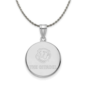 If you are a fan of The Citadel and the Bulldogs then you need to show your school spirit with this large disc necklace. We are a certified college jewelry retailer and this authentic item is officially licensed. The laser etched pendant is crafted from rhodium plated sterling silver. Includes a solid sterling silver diamond cut rope chain that is approximately 2.25mm in width by 26 inches in length and closes with a lobster clasp.