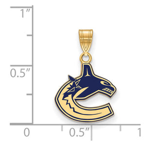 It is time to celebrate your favorite team, the Vancouver Canucks! This NHL enameled pendant created from 14k gold-plated sterling silver is officially licensed by the Vancouver Canucks and crafted in the USA. The approximate size is 13mm (1/2 inch) in width by 20mm (3/4 inch) in length with the bail. This item does not include a chain.