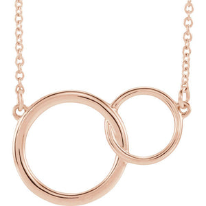 A simplistic yet elegant necklace design with a traditional or trendy style will give you a tailored look that goes from daytime wear to a night out on the town with ease. This polished necklace created from 14k rose gold features an interlocking circles design. The approximate pendant size is 20mm (3/4 inch) in width by 14mm (9/16 inch) in length. The solid cable chain closes with a spring ring clasp, is 1mm in width and adjusts 16 to 18 inches in length. This is a made to order item and is estimated to ship 11/24/2025
