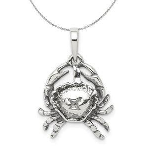 Cancer, the Crab. The Crab must first go backward in order to move forward, and so too the Sun upon the summer solstice begins to move backward toward the Equator. This antiqued sterling silver pendant features a 3-dimentional design that measures approximately 15mm (9/16 inch) in width by 23mm (15/16 Inch) in length, which includes the tapered bail. Includes an 18 inch, 1.25mm sterling silver cable chain with a lobster clasp closure.