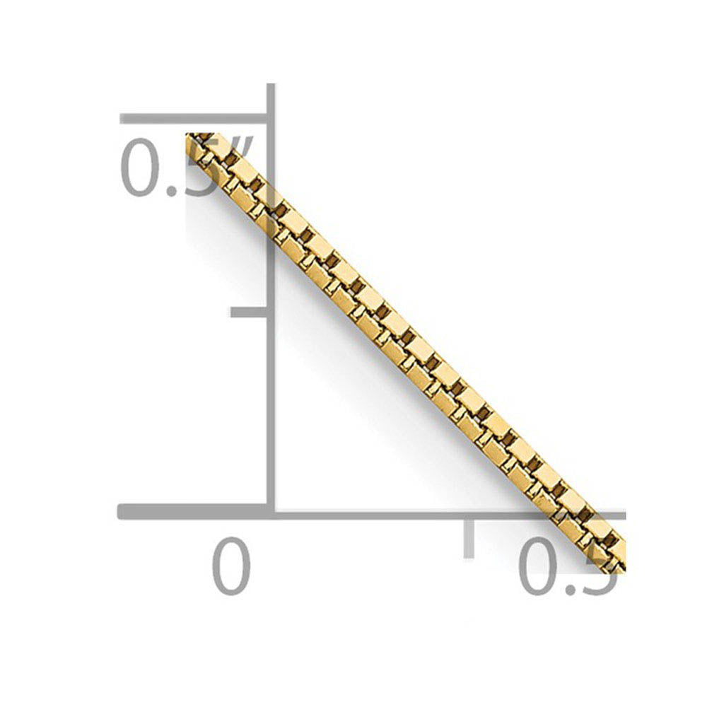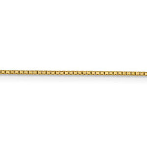 Box link chains are known for their strength and reliability as well as for their geometric style. This simple classic design is less likely to kink and made with wire that is rolled flat then folded into square uniform links that form open boxes or cubes that are interlocked in a straight line. This delicate pendant chain necklace features a solid link design with a lobster clasp created from polished 14k yellow gold and is approximately 1mm in width by 24-inches in length.