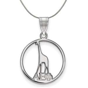 Show your greek life spirit with this Alpha Epsilon Phi Sorority pendant necklace. It is crafted with rhodium plated sterling silver and without the bail is 19mm in height and 18mm in width (0.75 in x 0.71 in). With the bail, the measurements are 25mm in height and 18mm in width. We are a certified LogoArt retailer and this authentic item is licensed by the Alpha Epsilon Phi Sorority and Greek Life. This pendant necklace is made the USA. Includes a 24 Inch, 1.25mm sterling silver franco chain.