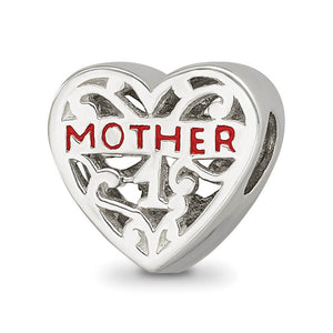 Let her know you love her today, tomorrow and always with this filigree MOM heart charm fashioned from red enameled sterling silver. It is approximately 10mm in width by 10mm in length. All of our charms feature a 4mm bead hole that is interchangeable as well as compatible with Reflections and other popular 3mm width bead style bracelets and necklaces.