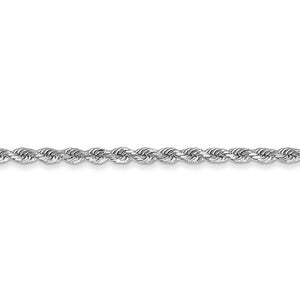 Spiraling rope chains made of rhodium-plated 10k white gold enhanced with diamond-cuts are extremely popular because they offer a classic design with maximum shine. Flexible and strong, this solid link, bracelet chain measures 1.75mm in width by 7-inches in length and closes with a lobster-claw clasp.