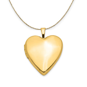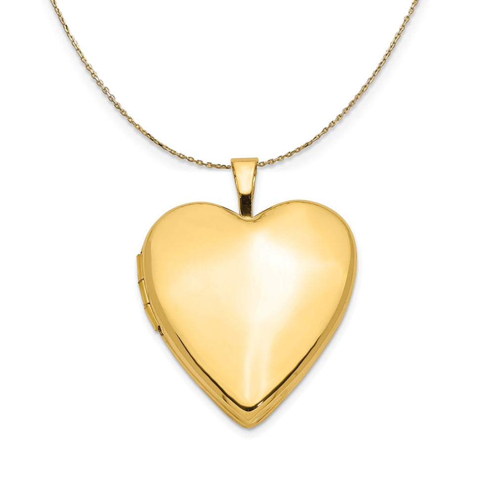 Show off your loved ones and keep them close with this 20mm heart locket fashioned from 14k yellow gold featuring a simple high polished design. Opens to hold two small photos or keepsakes and is suitable for hand engraving only. Includes a 18 inch long, 0.9mm wide, solid 14k yellow gold cable chain with a spring ring clasp.