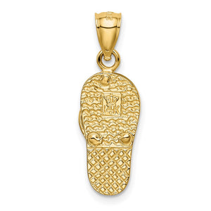 Tie the meaning to the moment with a classic or unusual pendant that makes it personal, thoughtful, or meaningful. This 3-dimensional flip flop pendant crafted in polished 14k yellow gold features a created white opal foot-bed. The approximate size is 8mm (5/16 inch) in width by 25mm (1 inch) in length with the bail. Please allow for slight variations in shades and pattern of stone. This item does not include a chain.