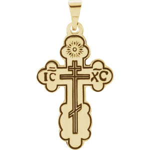 Celebrate and honor all special occasions with jewelry of religious significance! Our collection of spiritually inspired designs that show faith, hope and devotion are perfect for commemorating life's milestones. This Eastern Orthodox medium cross pendant crafted in 14k yellow gold features a black inlay design with a textured back. Not suitable for engraving. The approximate size is 17mm (5/8 inch) in width by 29mm (1 1/8 inch) in length with the bail. This item does not include a chain. This is a made to order item and is estimated to ship in about 6-8 days. Please email service@theblackbow.com for more details.