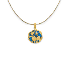 Captivating timeless piece of nature artistically sculpted in 14k yellow gold and blue stained glass, a reminder of the ocean's beauty and unending mystery. This dazzling translucent design measures approximately 20mm (3/4 Inch) wide by 27mm (1 1/16 inch) long, which includes the tapered bail. Includes a 18 inch long, 0.9mm wide, solid 14k yellow gold cable chain with a spring ring clasp.