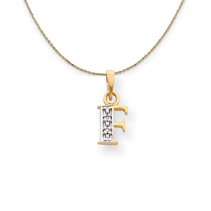 Adding a touch of glamour to your favorite initial is two prong-set white diamonds that are I-J in color, I3 in clarity. Each 8mm (5/16 Inch) letter is fashioned from 14k yellow gold with white rhodium plating and the approximate length including the tapered bail is 16mm (5/8 Inch). The pendant is . Includes a 20 inch, 0.8mm 14k yellow gold cable chain with a lobster clasp.
