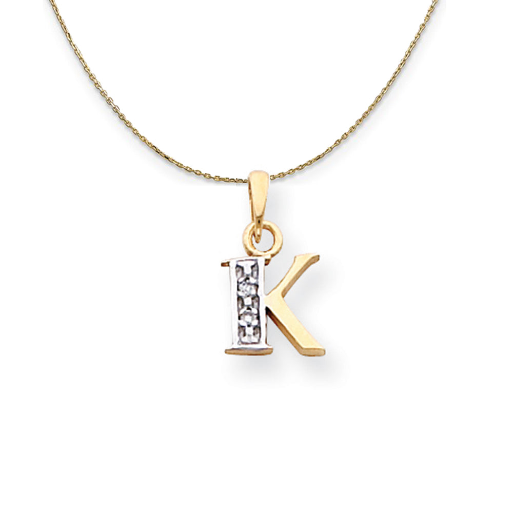 Adding a touch of glamour to your favorite initial is two prong-set white diamonds that are I-J in color, I3 in clarity. Each 8mm (5/16 Inch) letter is fashioned from 14k yellow gold with white rhodium plating and the approximate length including the tapered bail is 16mm (5/8 Inch). The pendant is . Includes a 16 inch, 0.8mm 14k yellow gold cable chain with a lobster clasp.