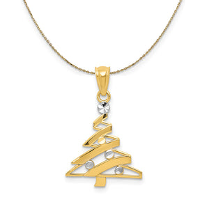 Adorn your holiday outfit with this two-tone Christmas tree that was crafted from 14 karat gold and rhodium. It has polished finish with a textured back and measures 5/8 Inch x 9/16 inch. Includes a 16 inch long, 0.9mm wide, solid 14k yellow gold cable chain with a spring ring clasp.