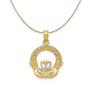 Tie the meaning to the moment with a classic or unusual pendant that makes it personal, thoughtful, or meaningful. This small claddagh circle pendant crafted in 14k yellow gold features a polished and textured design. The approximate size is 15mm (9/16 inch) in width by 20mm (3/4 inch) in length with the bail. Includes a 20 inch long, 0.9mm wide, solid 14k yellow gold cable chain with a spring ring clasp.