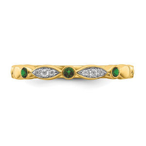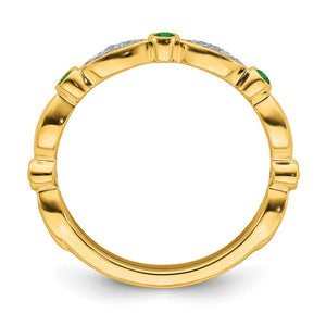 Make it simple and stylish with bands of different textures, finishes, widths and colors or extravagant with diamonds and gemstones! This stackable ring created from solid 14k yellow gold features 3 lab created-emeralds totaling 1/15 of a carat and 6 genuine diamonds totaling 1/20 of a carat. The natural diamonds are I2 in clarity and I-J in color. The color range varies on all lab-created gemstones so please allow for slight variations in shades (medium dark to dark color). The color on your screen may also not reflect actual gemstone color due to variations in monitors. The approximate band width is 2. Mm. Guaranteed to fit together perfectly with all of the mix and match Stackable Expressions rings.