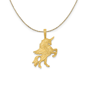 Tie the meaning to the moment with a classic or unusual pendant that makes it personal, thoughtful, or meaningful. This Pegasus pendant crafted in 14k yellow gold features a diamond-cut and textured flat design. The approximate size is 19mm (3/4 inch) in width by 28mm(1 1/8 inch) in length with the bail. Includes a 20 inch long, 0.9mm wide, solid 14k yellow gold cable chain with a spring ring clasp.