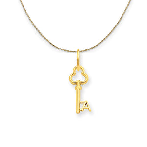 Featuring a shamrock bow and a block initial bit, this charming petite key will help you create a subtle style that is all about you. It is fashioned from polished 14k yellow gold, measures approximately 4mm (5/16 inch) in width by 14mm (9/16 inch) in length and is finished with an open jump ring. The pendant is . Includes a 20 inch, 0.8mm 14k yellow gold cable chain with a lobster clasp.