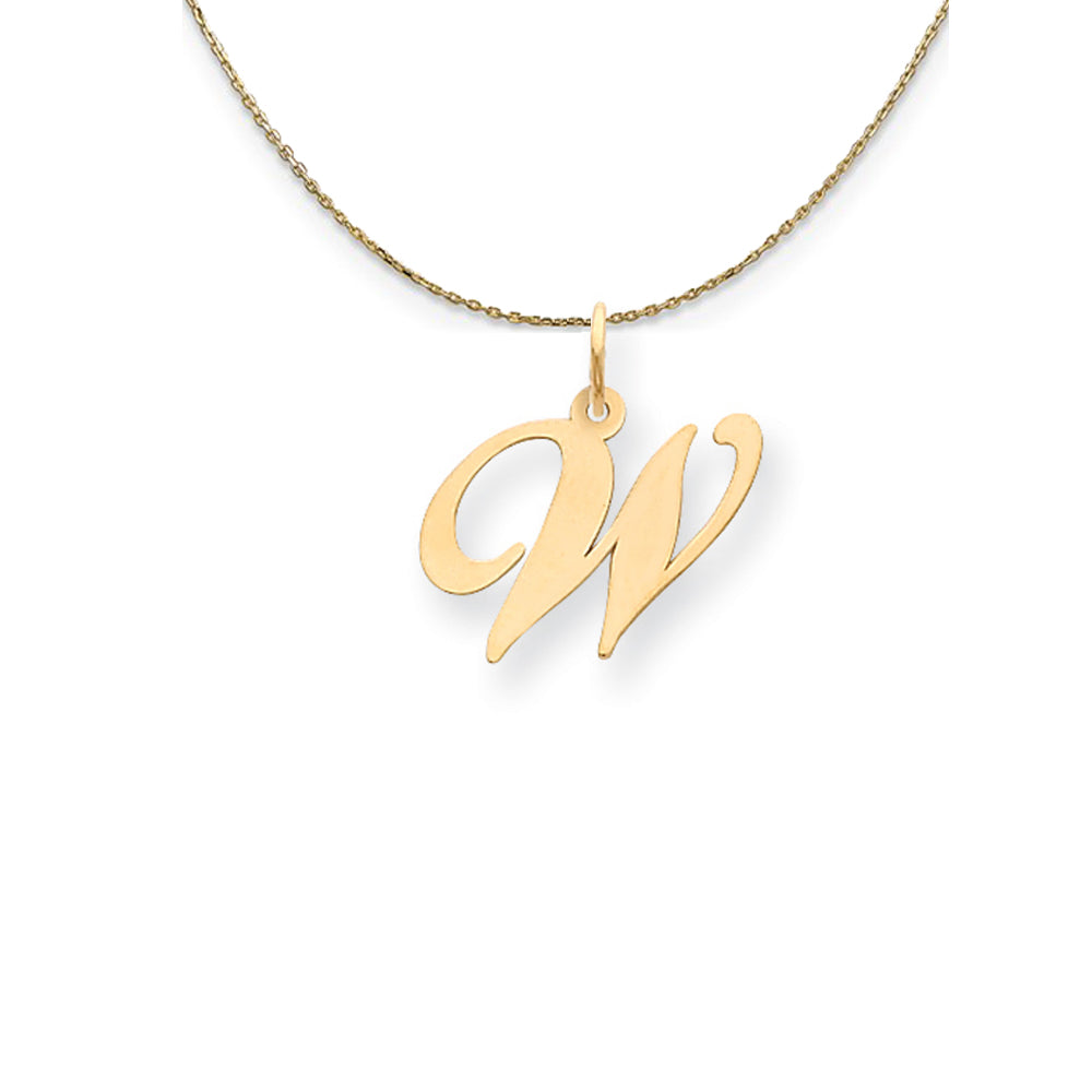 Indulge in a traditional initial charm that subtly enhances and personalizes your jewelry. Each fancy script letter is approximately 19mm (3/4 inch) in length, fashioned from 14k yellow gold with a high polished finish and includes a standard jump ring. Includes a 18 inch long, 0.9mm wide, solid 14k yellow gold cable chain with a spring ring clasp.