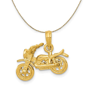 Add a unique focal point to a classic outfit with this motorcycle pendant fashioned from polished 14k yellow gold. It features a 3-dimensional moveable design and measures approximately 18mm (11/16 inch) in width by 16mm (5/8 Inch) in length, which includes the tapered bail. The pendant is Includes a 30 Inch, 0.8mm 14k yellow gold cable chain with a lobster clasp.