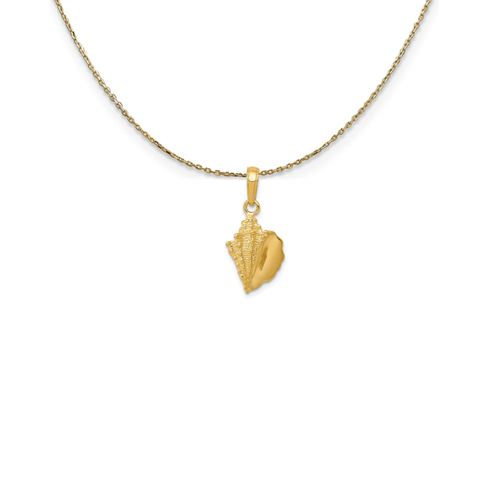 Capturing the perfection of nature's own design in a timeless seashell sculpted in polished 14k gold. This 2-dimensional conch shell pendant measures approximately 11mm wide by 20mm long, which includes the tapered bail. Includes a 18 inch long, 0.9mm wide, solid 14k yellow gold cable chain with a spring ring clasp.